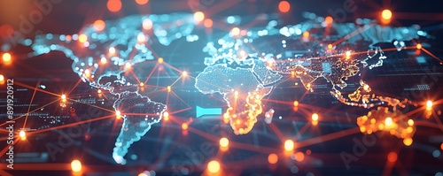 Clear, realistic depiction of a global network with a world map and luminous data nodes, photographed in high resolution.