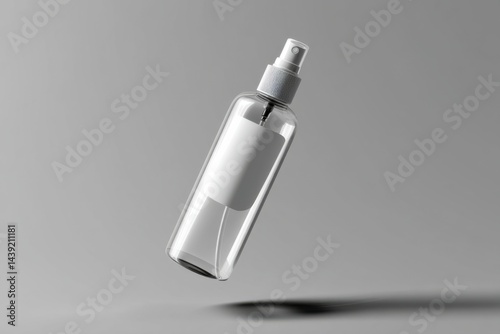 Clear spray bottle suspended in mid-air with minimalistic design against a neutral background