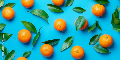 Clementines with vibrant leaves displayed on a blue background create a stunning flat lay. This top view of clementines showcases their freshness and vivid colors beautifully.