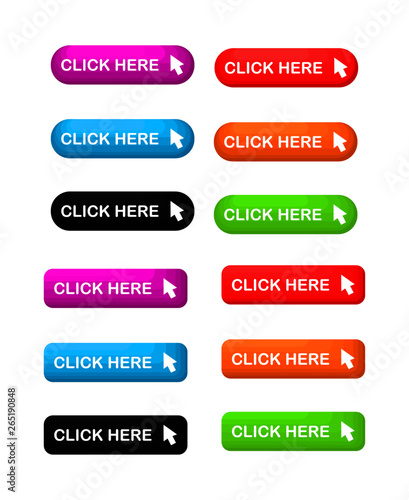 Click Here colorful button set. icons web Isolated on white background. Vector Illustration.
