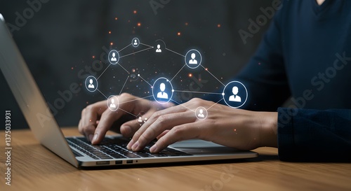 Client information management and analytics system.Searching and analyzing lead customer data of list. Businessman typing on laptop computer keyboard at desk in office.