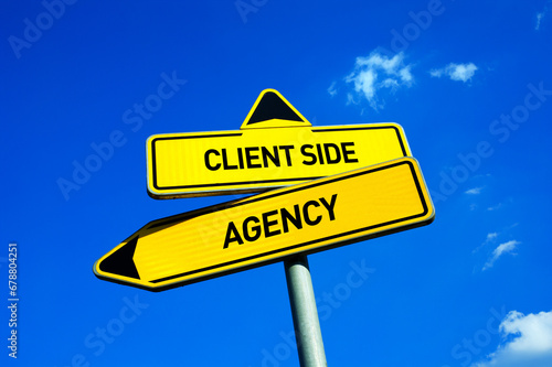 Client side vs Agency - choosing between two types of work, job and career. Traffic sign with two options.