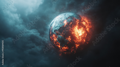 Climate Change Effects, An image of Earth on fire amidst dark, swirling clouds, highlighting the urgent impact of climate change and environmental destruction