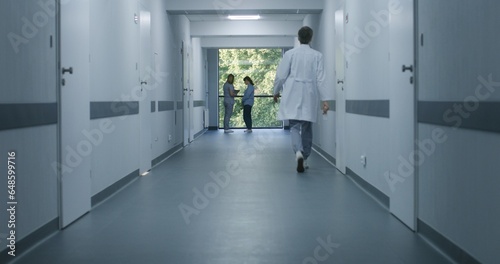 Clinic corridor: Doctors and professional medics walk. Nurse with digital tablet comes to elderly woman standing near window. Medical staff and patients in modern hospital or medical center hallway.