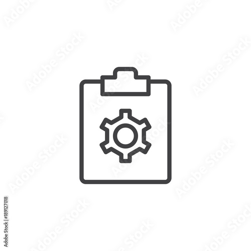 Clipboard with cog gear line icon, outline vector sign, linear style pictogram isolated on white. Document file setting symbol, logo illustration. Editable stroke
