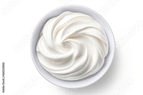 Clipped isolated swirl of sour cream in white bowl parallel to Greek yogurt