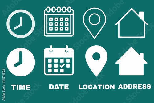 Clock, calendar, location. Time, date and address icon set. travel icons set