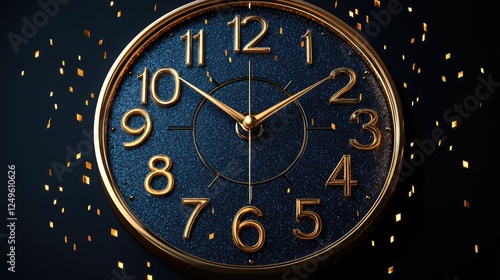 Clock face with gold confetti on dark background, ideal for New Year's projects.