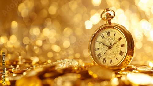 Clock indicating value surrounded by gold coins on a bright background, isolated and clean