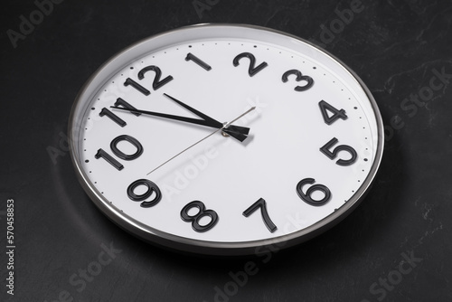 Clock showing five minutes until midnight on black table. New Year countdown