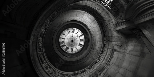 Clock with roman numerals on it is in the center of a spiral
