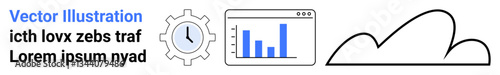 Clock within gear, bar graph in browser window, and simple cloud outline. Ideal for analytics, planning, technology, time management, data, productivity simple landing page