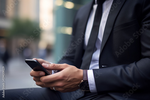 Close - up image of business man watching smart mobile phone device outdoors - Businessman networking typing an sms message in city street