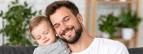 Close bond between father and sleeping child in a cozy studio setting with light background and blurred home elements