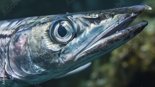 Close focus on the reflective eye of a barracuda, intense and vigilant, captured in the depths.