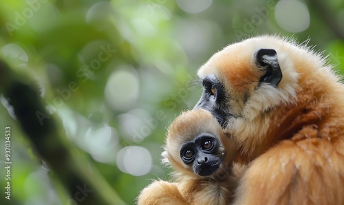 close image of Yellow Cheeked Gibbon monkey (Nomascus Gabriallae) mother with child in the forest.