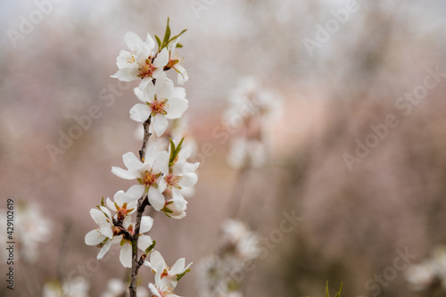 Close up apple blossom white and pink flowers, flowering branch of apple tree, picturesque symbol of early spring, Petrin hill, fruit orchard, sunny day, selective focus, blurred background, Prague