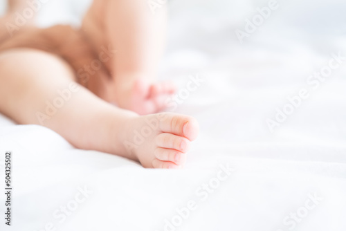 Close up baby barefooted legs feet lying on white bed linen. Neutral pastel light color tones