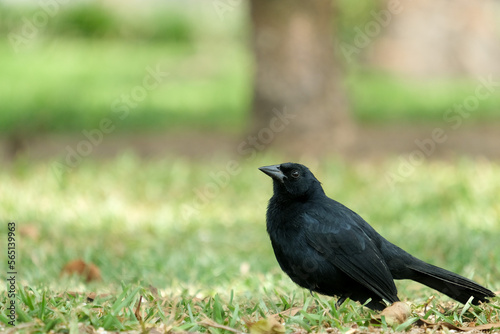 Close up black bird standing on the ground and watching around. Selective focus. Open space area.
