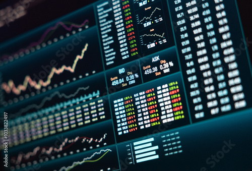 Close up business data on a notebook screen. Stock market trading information, chart, graph and index data.