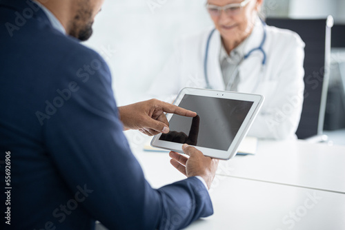 Close up business man hands working on tablet during the meeting