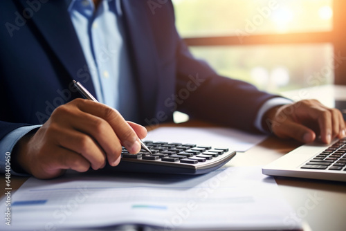 Close up businessman using calculator on documents Unrecognizable finance use calculate about cost at office