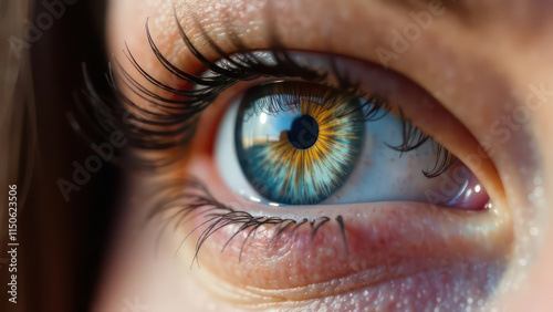 Close up cropped view of eye of woman with rainbow pupil, happiness