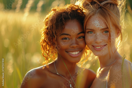 Close up fashion portrait two different races women hugging, black African American and white redhead with freckles touching their heads faces to each other on summer nature grass background