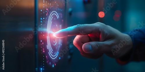 Close up finger touching digital lock shield button on touchscreen interface symbolizing modern electronic protection and cybersecurity technology
