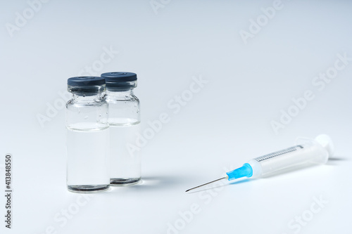 Close up glass vial with flu vaccine and syringe with needle. The concept of vaccination or preventive treatment of injection diseases.
