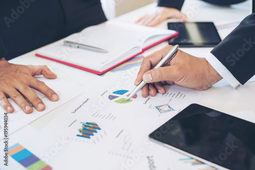 close up hand of marketing manager employee pointing at business document during discussion at meeting room , Notebook on wood table - Business concept