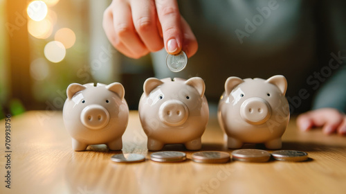 Close up, hand putting coins in one of three piggy bank. Saving money, invest, and health care concept. Money saving for family expenses, invest property, investment of business, and for health care.