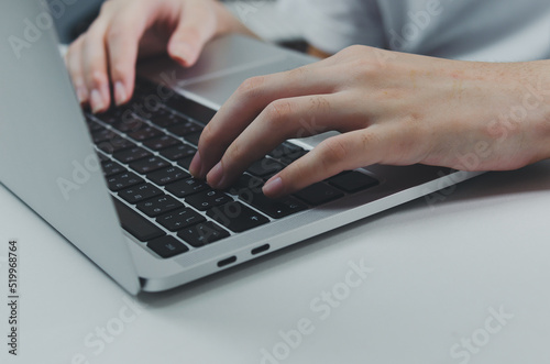 close up hand woman typing keyboard computer laptop on desk.Business technology online and communication on desk.