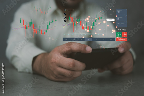 Close up hands holding smartphone with stock market diagrams, hologram with bar chart and growing lines. Numbers and dynamic changes, financial analysis. Technology business investment concept