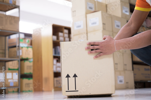 Close up hands of warehouse worker lifting box in storage room.Man worker working in industrial factory.Male holding package for delivery logistic to customer.
