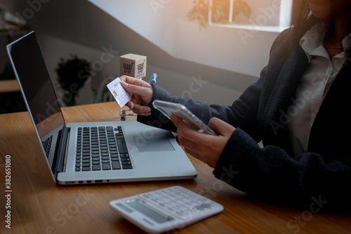 Close up Hands using credit card and smartphones for online shopping and paying via the internet ,Toned picture, e-commerce, SME,internet banking, spending money, working from home concept