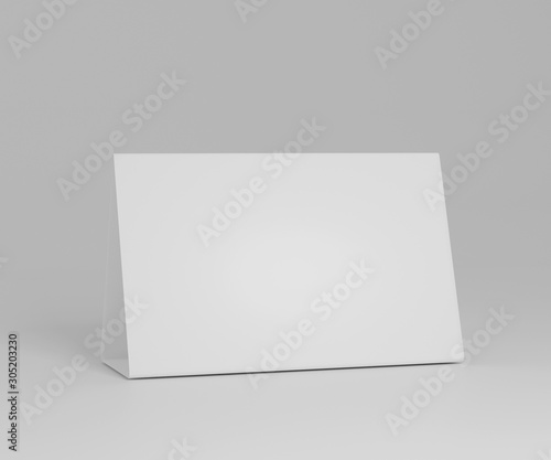 Close up horizontal elongate white blank paper table card 3d illustration isolated on white background with clipping path,Mockup table tent blank, Stand for booklets with white sheets of paper.