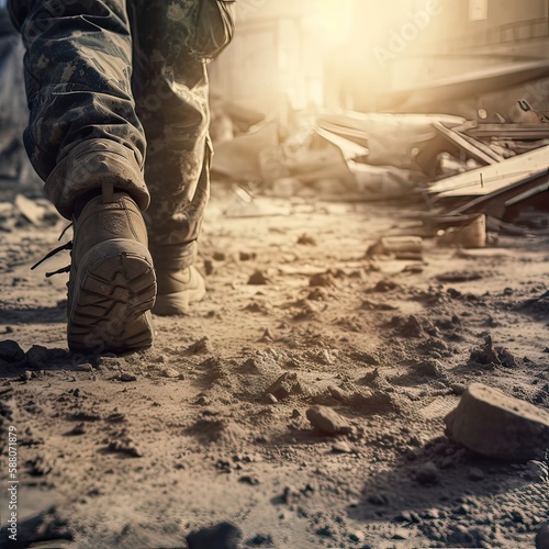 close up Illustration of a military man walking on an empty destroyed environment. Destruction, war scene. Smoke and fog. Sad combat feeling. Generative Ai.