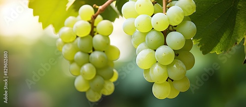 Close up image of green and white grapes on a vine in a grape garden with a shallow depth of field and selective focus for a copy space image Handled branch of ripe grapes for harvesting
