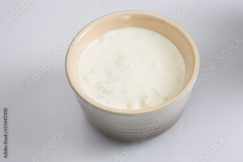 close up isolated top view shot of a brown beige bowl filled with a delicious blue cheese dipping sauce on a white background