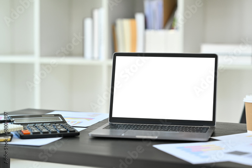 Close up laptop computer with white screen, calculator and financial documents on black office desk