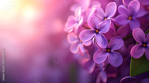 Close up lilac flowers in bloom during spring, glowing warmly in the light of the setting sun. Copy space.