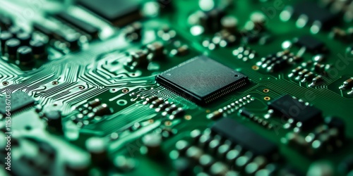 Close up macro image of a green computer printed circuit board, featuring selective focus on a blank chip, highlighting the intricate details of the printed circuit board.