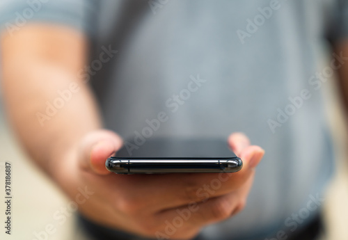 Close Up man hand holding using smartphone