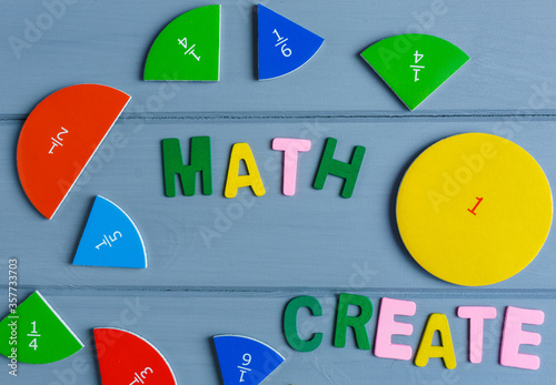 Close up mathematical fractions and colorful letters on gray background. Creative, fun mathematics banner. Education, back to school concept