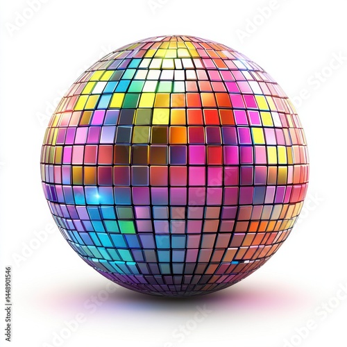 Close Up Mirror Disco Ball with Multicolored Reflections on White Background