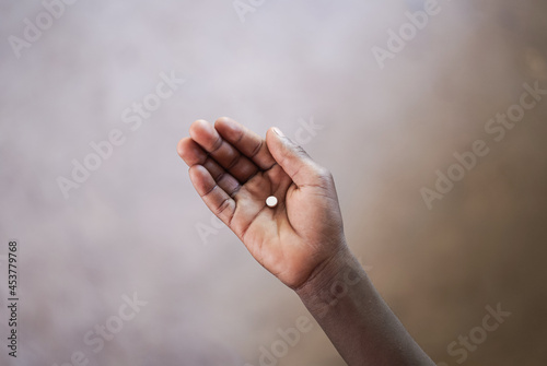 Close up of a black child's hand holding a single pill; African healthcare concept