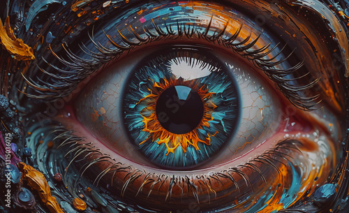 Close up of a blue eye with orange highlights. The eye is surrounded by a colorful background, giving it a vibrant and artistic appearance