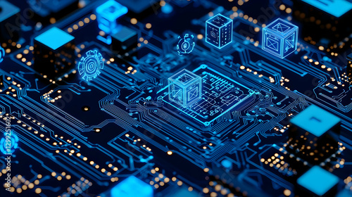 Close Up of a Blue Illuminated Circuit Board with Abstract Patterns and Electronic Components