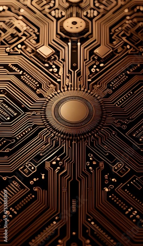 Close up of a brown high tech circuit board background illustration. AI generated.